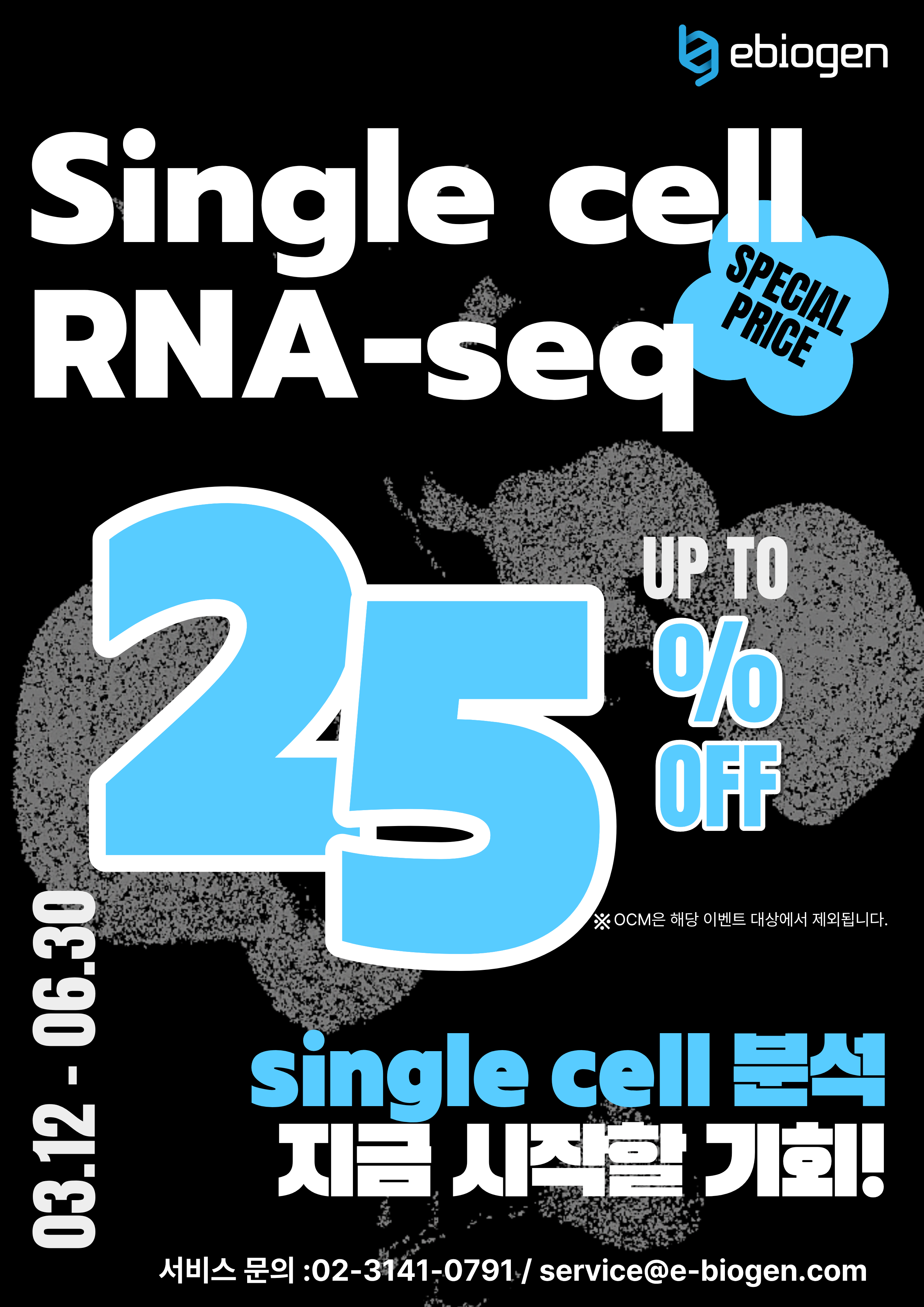 Single Cell RNA-seq 최대 25% 할인 이벤트 안내 이바이오젠 2026-03-12 14:01:04 view : 56 목록 다음글mRNA-Seq 9+1 한정 프로모션 (~05.31)2026.02.13